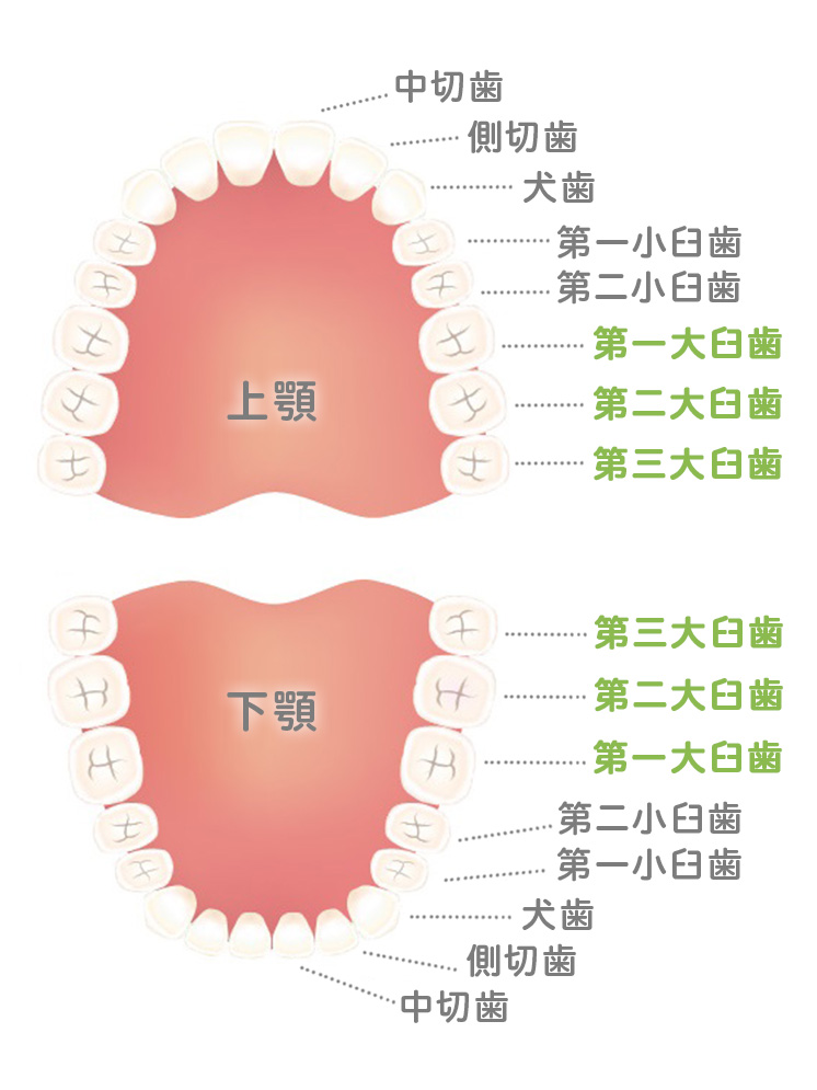 奥歯とは、第一大臼歯から第三大臼歯までの歯のことで、上下左右合わせて合計12本あります。